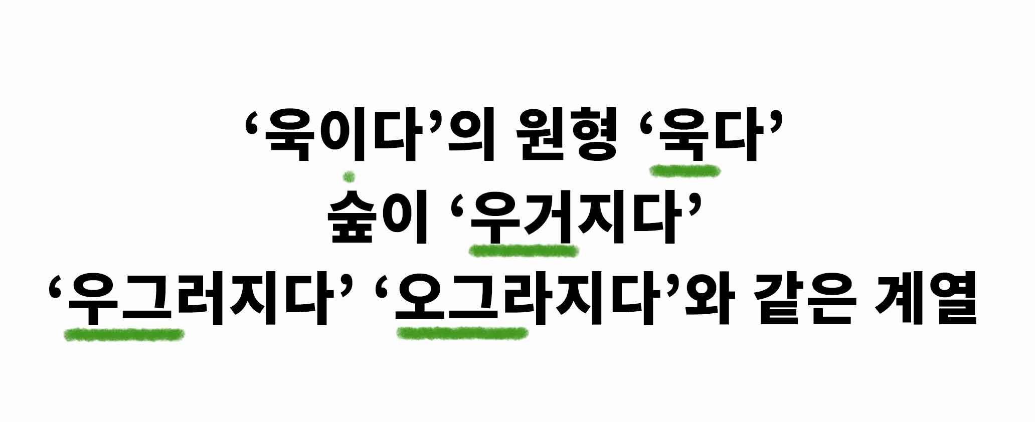 '욱다' 뜻 보니까요, 요거 우리에게 친숙한 단어 생각나지 않나요? 바로 우거지다 랑 연관이 있는 동사였습니다!