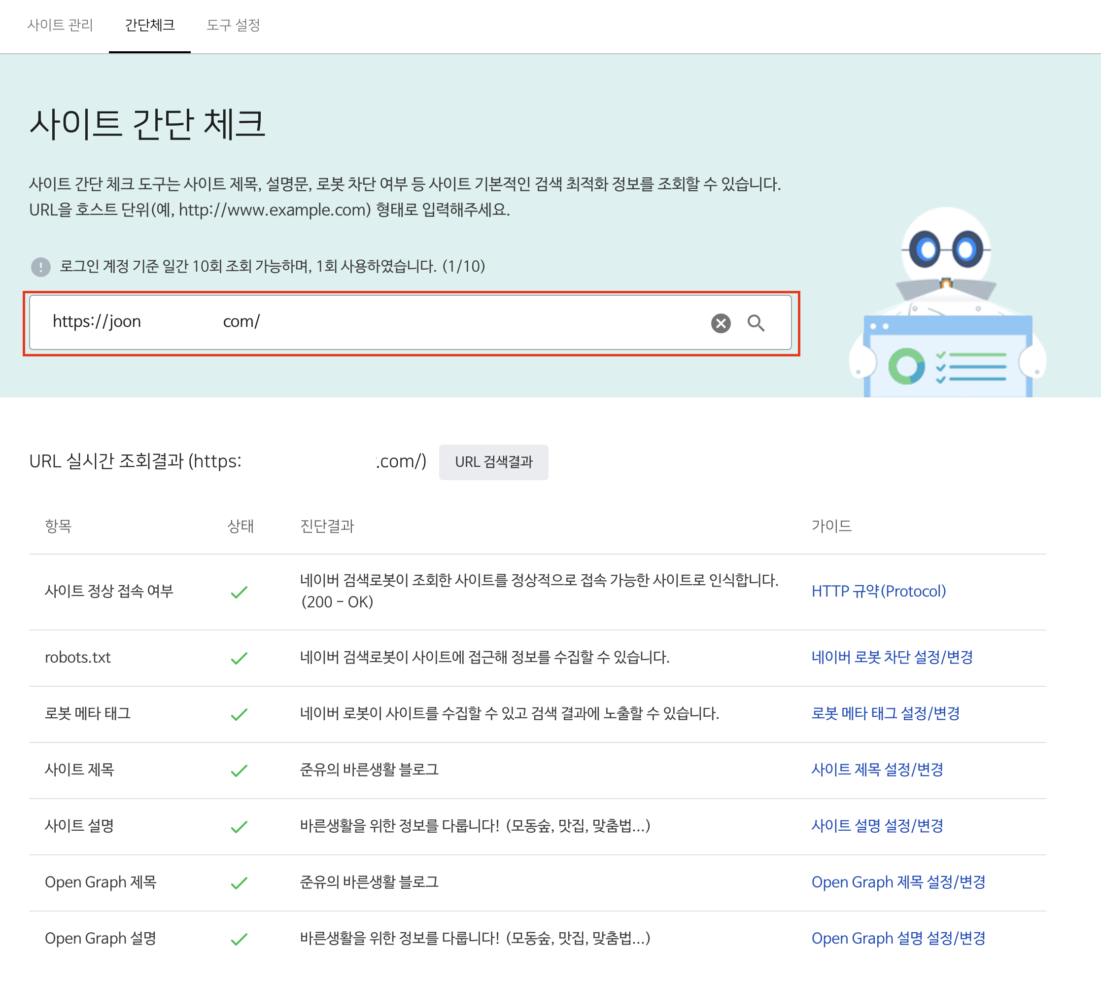 내 티스토리 블로그 주소 넣고, [돋보기 아이콘]을 클릭해 주시면~!