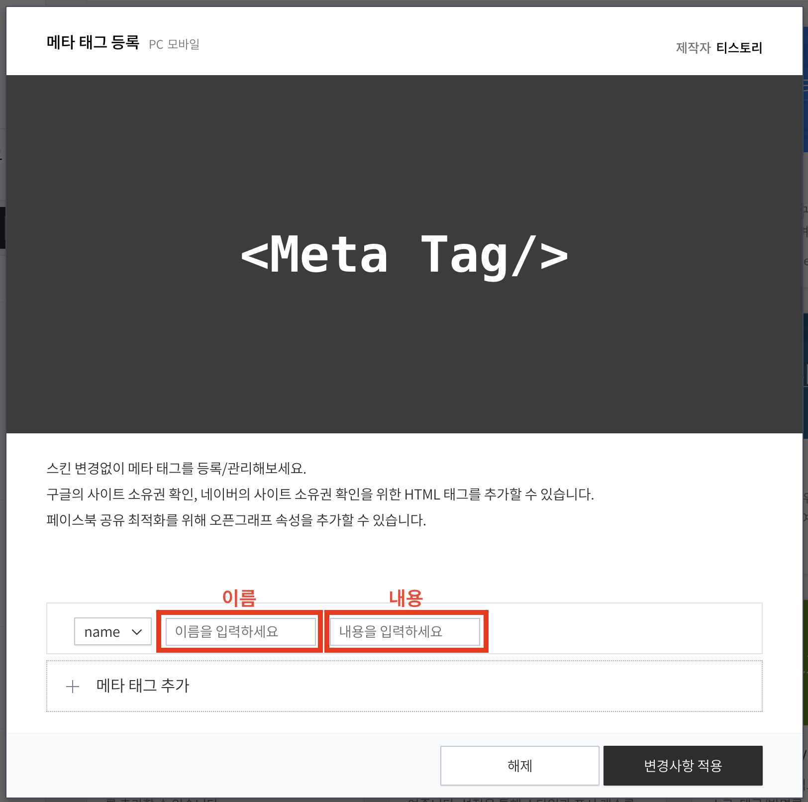 아래 메타 태그 등록 [이름을 입력하세요]라는 부분에 붙여넣어 주세요 (Ctrl+V)
