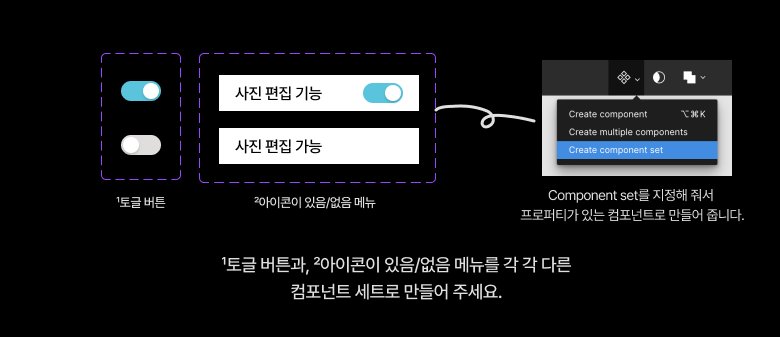 Create Component set으로 컴포넌트화 시켜줍니다. 그러면 오른쪽 화면에