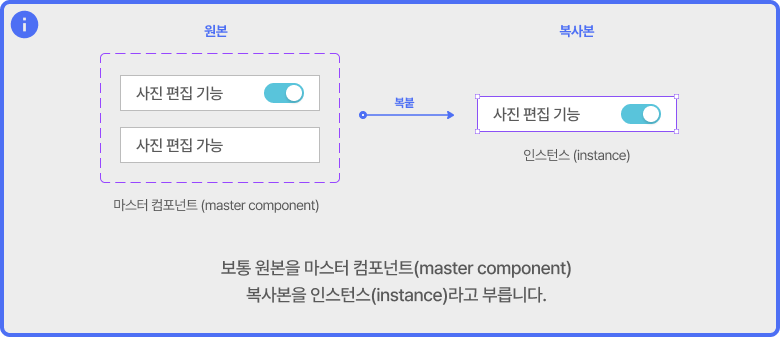 컴포넌트를 복사해서 사용하는 것을 인스턴스라고 합니다.