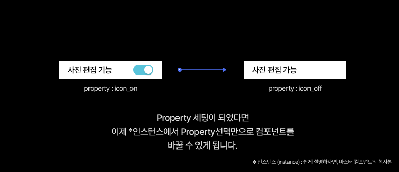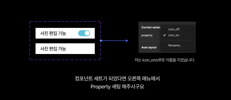 Property(상태 옵션)이 있는 컴포넌트가 만들어 집니다! 얘네 옵션은 On/Off로 해줘서 켰다/껐다 가능한 컴포넌트로 만들어 줍니다.