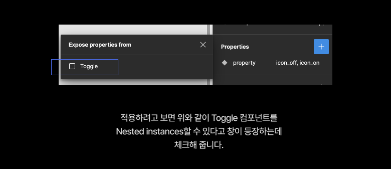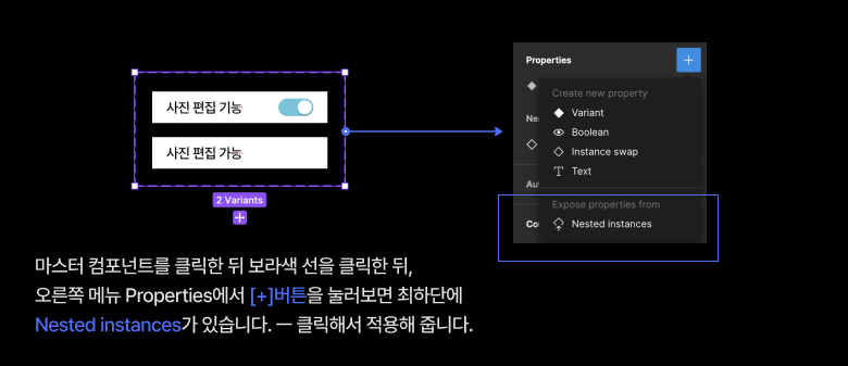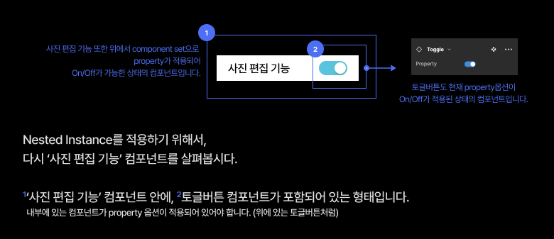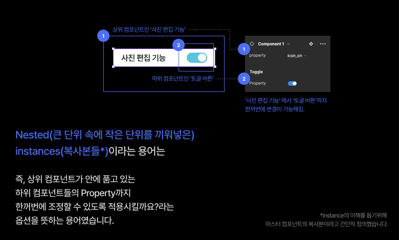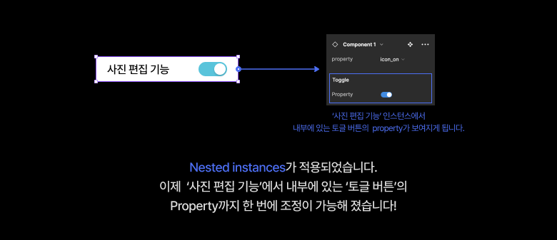 Nested instances는 결국 큰 단위가 작은 단위를 포함할 때, 큰 단위에서도 작은 단위의 Property(상태 옵션)을 조정할 수 있도록
