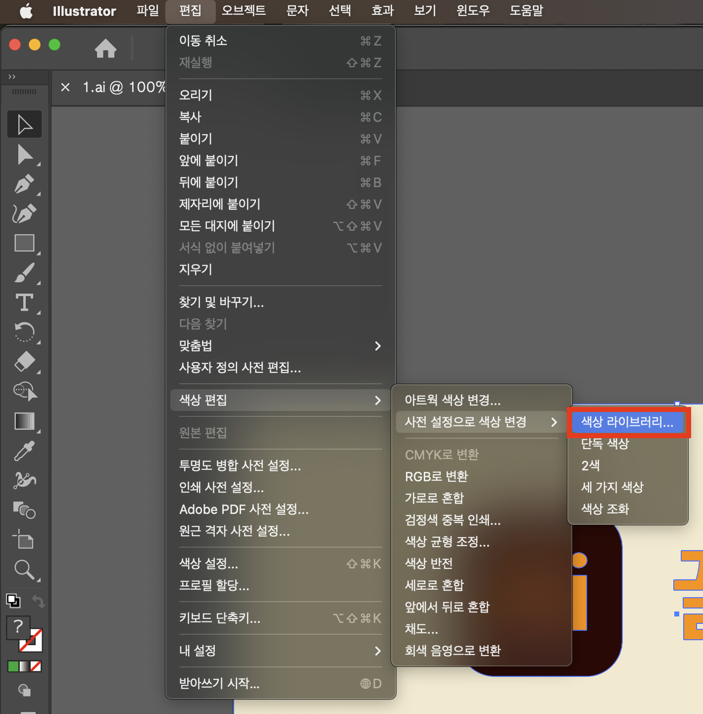 2. 편집 > 색상 편집 > 사전 설정으로 색상 변경> 색상 라이브러리 선택!