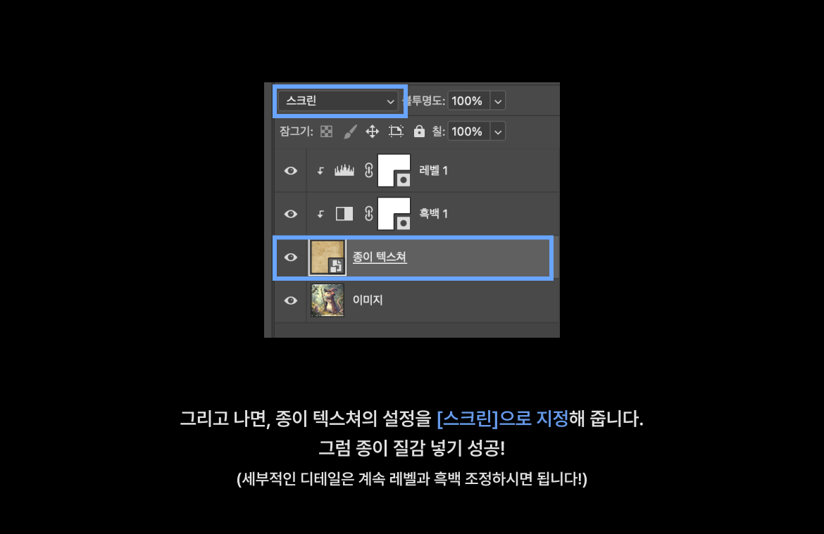 - [레벨]과 [흑백] 레이어말고, 종이 텍스쳐 레이어 자체를 [스크린] 으로 변경해 주세요.