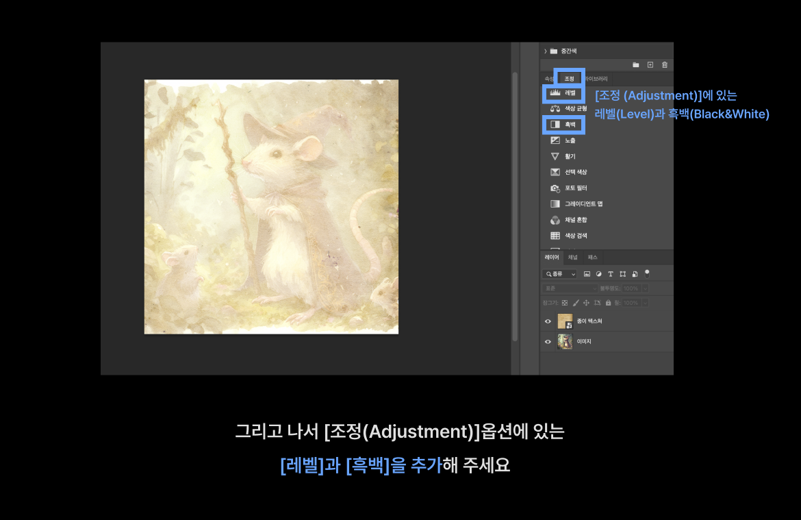 3. 추가한 뒤에는 종이 텍스쳐에 [레벨]과 [흑백]을 씌워주세요.