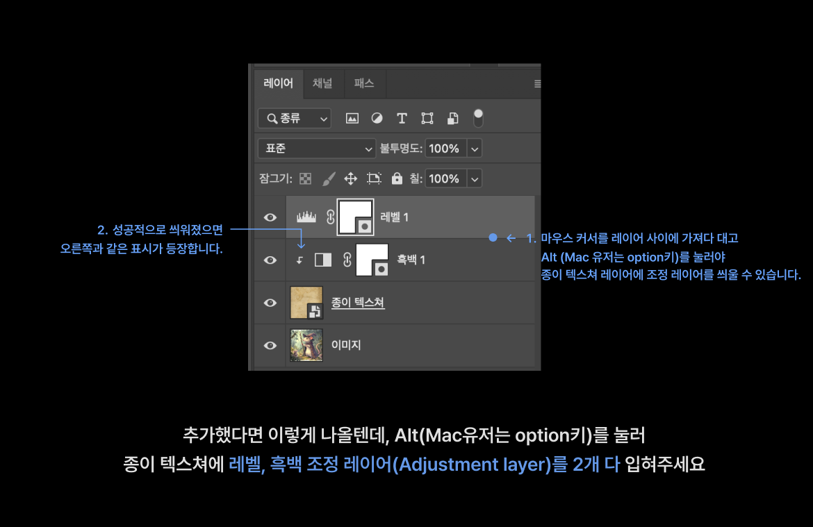 - 1) 마우스 커서를 레이어 사이에 가져다대고, 윈도우 유저는 Alt키 / 맥 유저는 Option키를 눌러서
