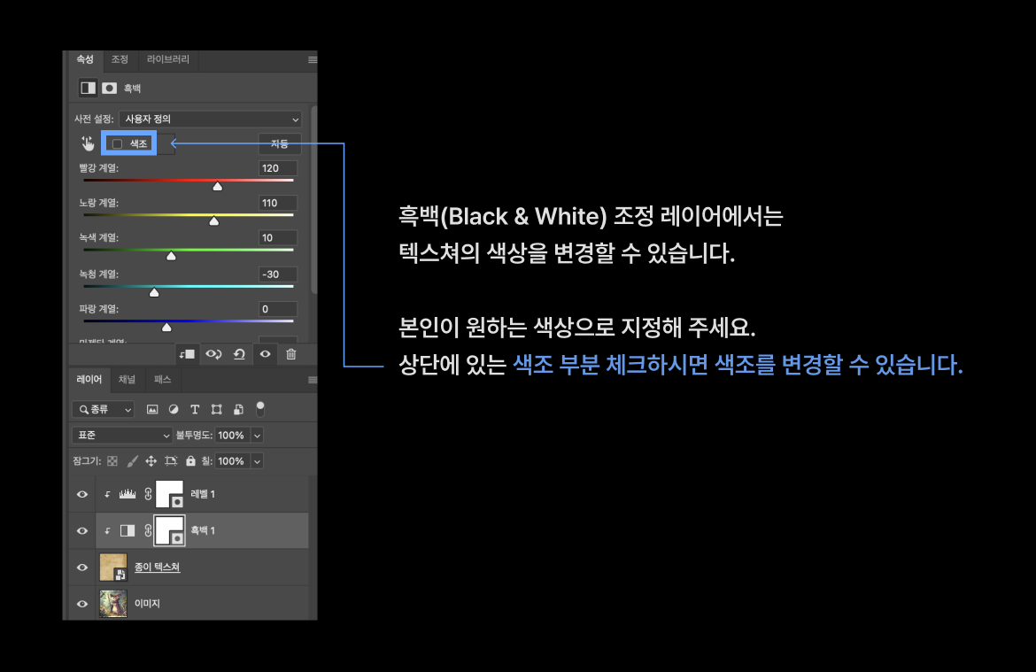 4. [흑백] 조정 레이어에서 색상을 변경합니다.