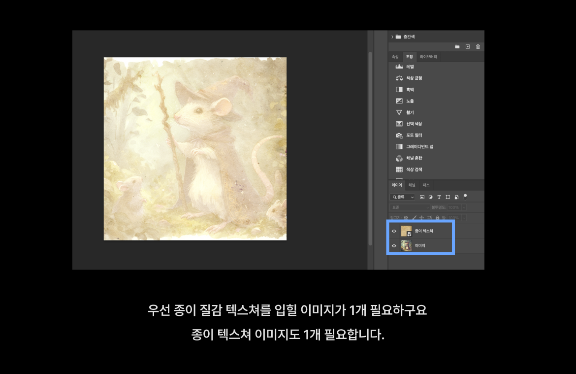 - 당연히 다운받은 종이 텍스쳐는 위에 이미지처럼 텍스쳐 입힐 이미지 위에 위치시켜 주세요.